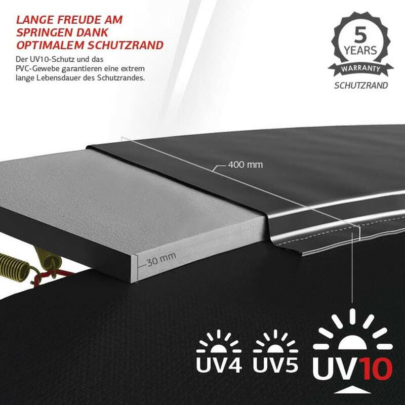 Vysoký počet silných pružin (o 30% pružin více v porovnání se standardními trampolínami!) Se díky novému postupu nasazuje při montáži mnohem snadněji (červené oko pružiny na červenou značku na rámu). Pružiny jsou navíc vybaveny velmi odolným zinkováním, které zajišťuje vynikající antikorozní vlastnosti.