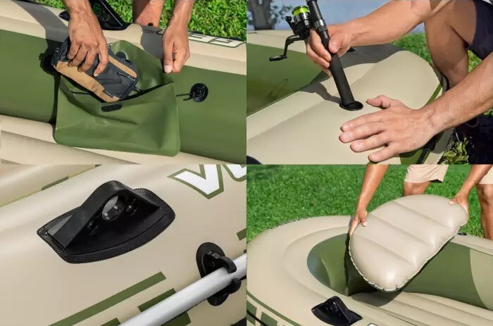 Člun je navíc vybaven po stranách držáky vesel a vestavěnými držáky na rybářské pruty, což ocení každý nadšený rybář.
