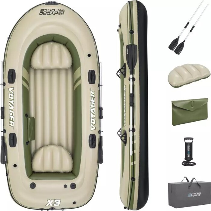 S člunem Voyager X3 dostanete vše potřebné pro okamžité vodní dobrodružství – pár hliníkových vesel, ruční pumpu, přenosnou tašku a záplatu na opravu pro případ nečekaných situací.