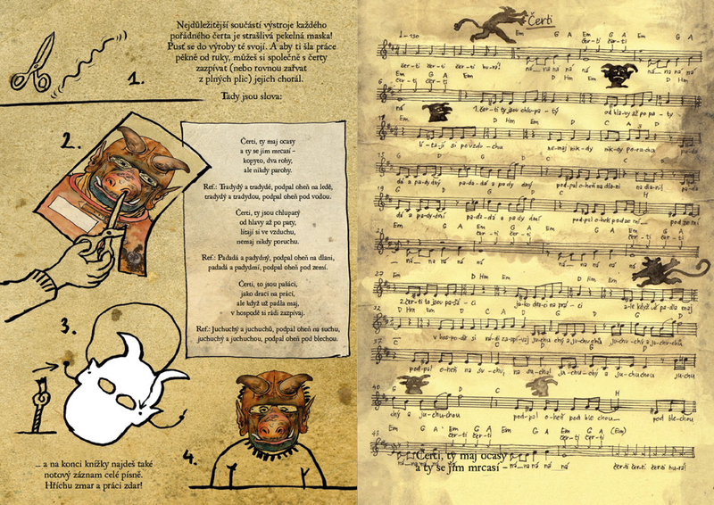 V této originální knize najdete součást speciálního zadržovacího vybavení: strašidelné čertovské masky na vystřihování. Barevné, které si stačí jen nasadit a všem hříšníkům okamžitě zavařit, a černobílé na samostatné vybarvení. A k práci nebo při strašení si můžete zazpívat (zarevat) společně s čerty jejich pekelnou píseň. Příjemnou zábavu a hříchu zmar!