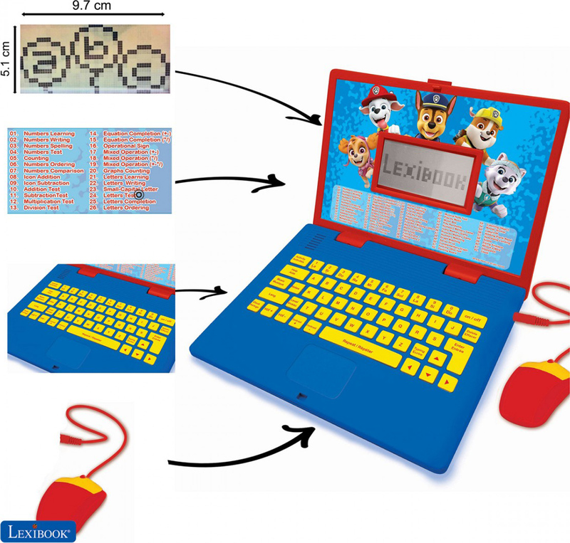 Pokud hledáte způsob, jak zapojit vzdělávací prvek do herních aktivit, pak je tento dětský notebook ideální volbou. Podoba jako skutečný notebook, reálná myš a LCD displej o velikosti 5,1 x 9,7 cm jsou lákadlem pro všechny malé nadšence, kteří se chtějí přiblížit dospělému světu. 124 aktivit z různých oblastí, z nichž polovina je v češtině a druhá polovina v angličtině, je určena na zábavné učení, trénování paměti, rychlosti a zlepšování obecných dovedností. Na výběr je matematika, kde se děti naučí nejen čísla, ale i základní početní operace. Učení dvou jazyků je seznámí s písmeny, slovy a výslovností a dvojjazyčná klávesnice jim umožní vyzkoušet si psaní. Hraní paměťových her jim pomůže potrénovat logiku a hudba, kde děti určují správné znění melodií, také není opomenuta. V notebooku najdete také hry a poznávání času.