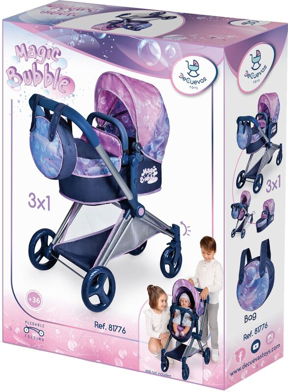 DeCuevas 81776 Skládací kočárek pro panenky 3 v 1 s taškou Magic Bubble 2024 - 73 cm patří do stejnojmenné kolekce, která je novinkou roku 2024 a nabízí několik různých druhů kočárků.