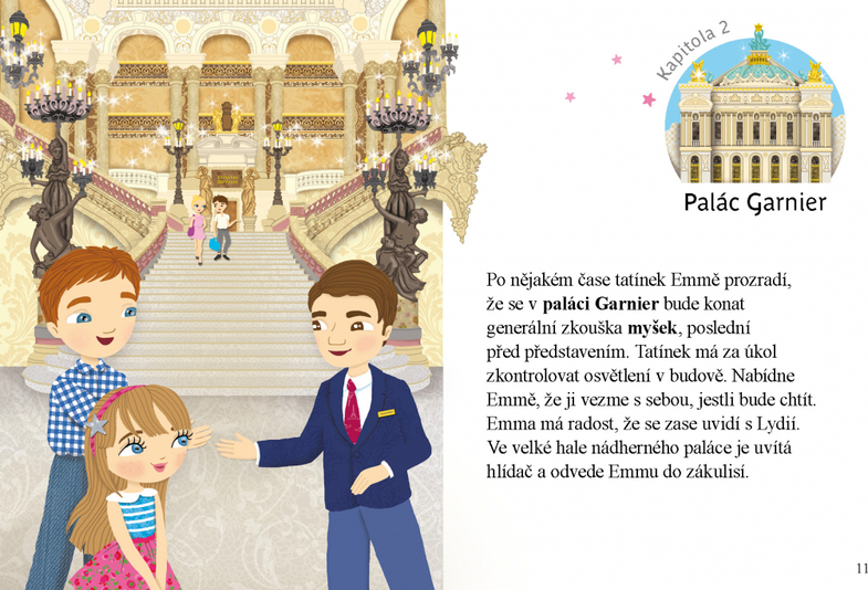 Jednoho dne vezme táta Emu do práce. Je elektrikář a musí jít do taneční školy Národní pařížské opery, kde studují budoucí tanečnice a tanečníci nazývaní myšky. Emma se tu seznámí s myškou Lýdiou. Po nějaké době navštíví jejich generální zkoušku, ale Lýdia na ní chybí. Vyvrtnula si kotník a hrozí, že nebude moci vystupovat! Naštěstí Emma najde tajemnou černou perlu. Pošle ji Lýdii poštou a když potom navštíví slavnostní představení myšek, Lýdia září uprostřed nich. Na krku se jí třpytí kouzelná perla.
