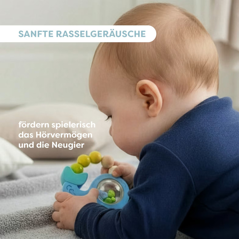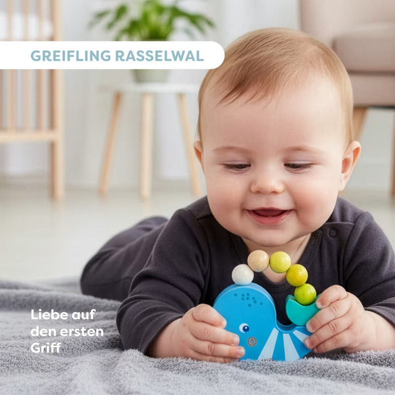 Hryzátko s hrkálkou s motivem velryby je nádherná první dřevěná hračka pro zvídavé malé objevitele.