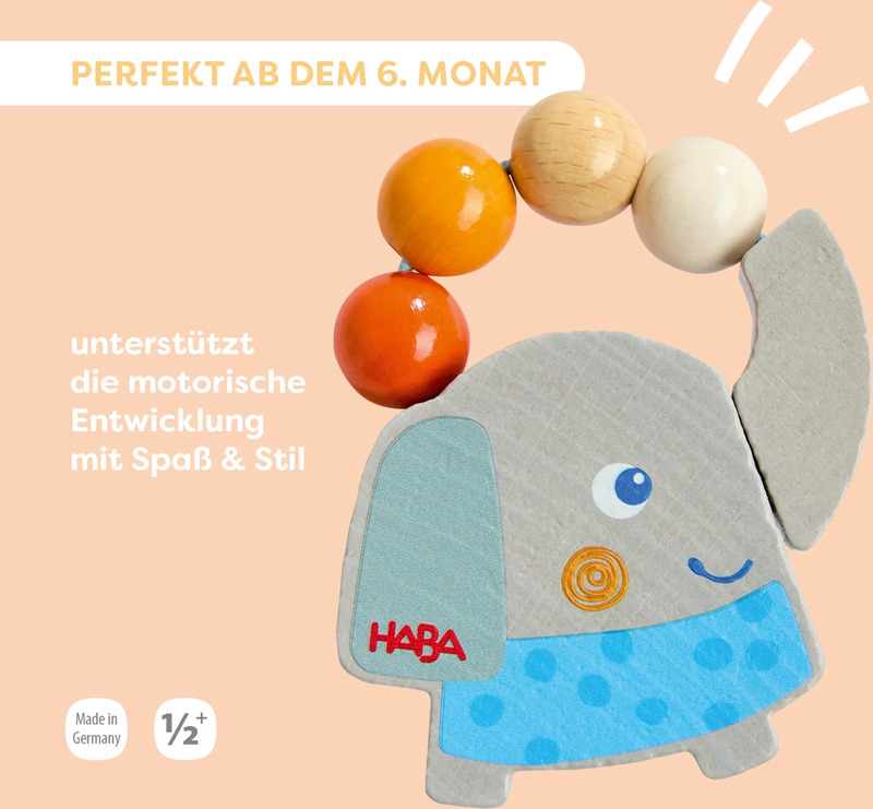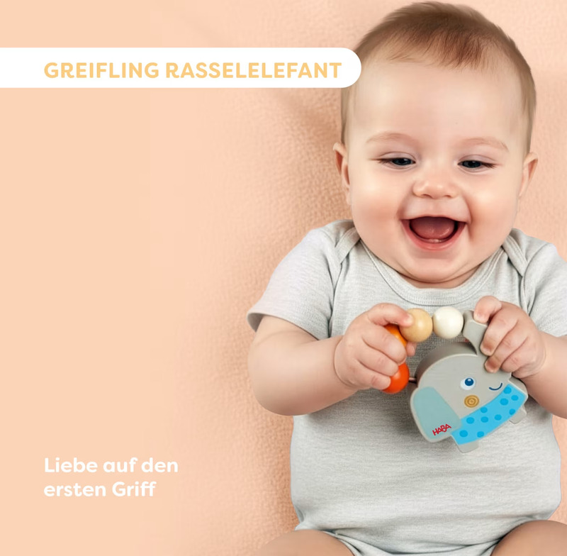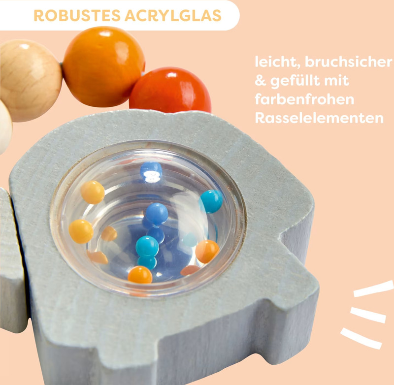 Hryzátko Slon s hrkálkou je ideální první dřevěné hračky pro nejmenší.