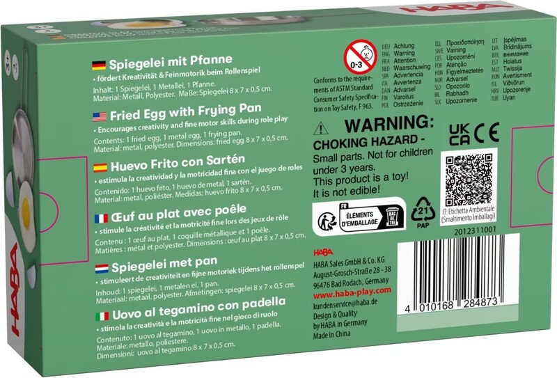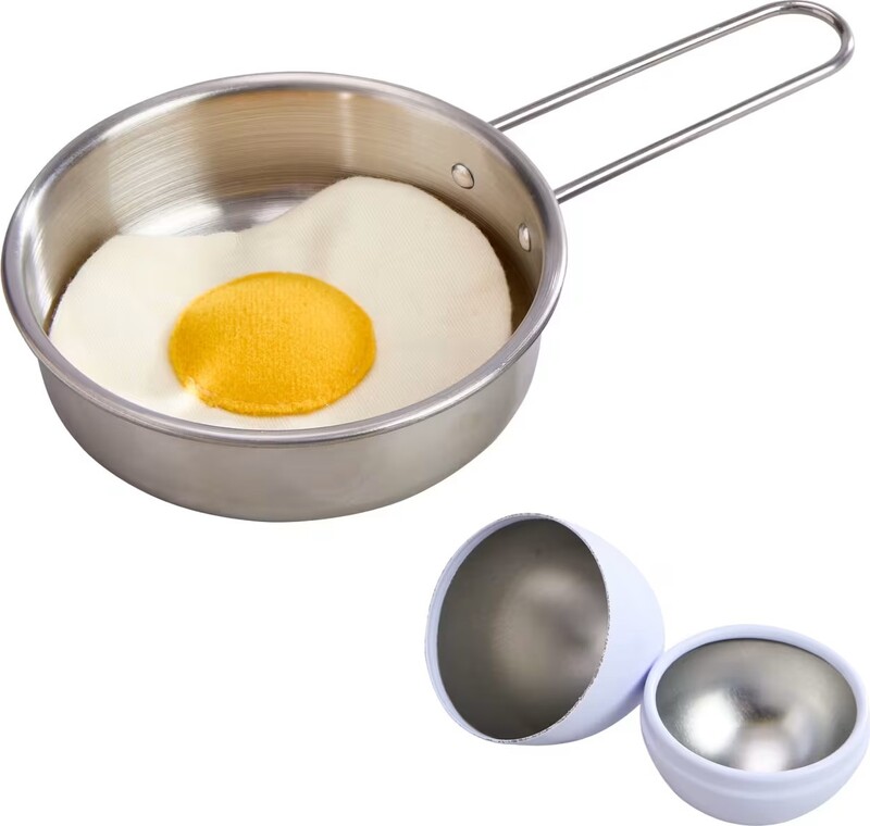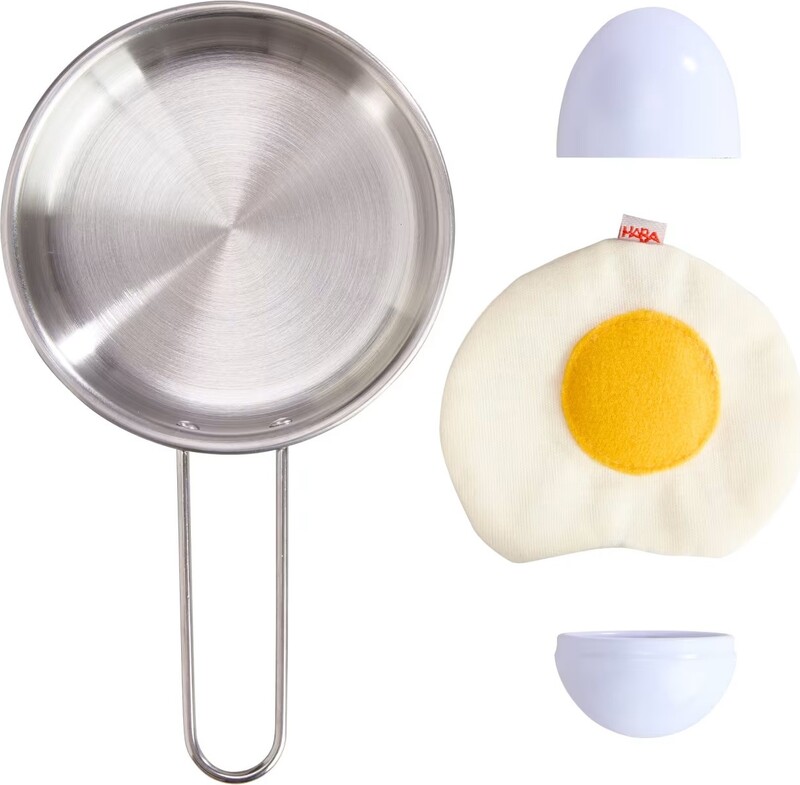 Toto měkké látkové vajíčko je ukryté v kovovém obalu, který mohou děti „rozbít“ a vajíčko následně „osmažit“ přímo na přiložené pánvi.