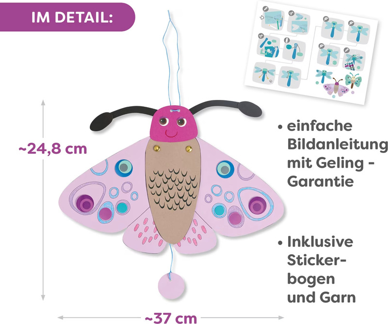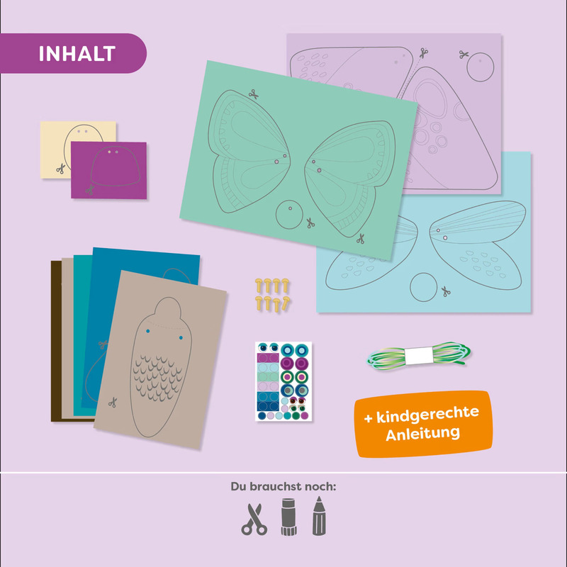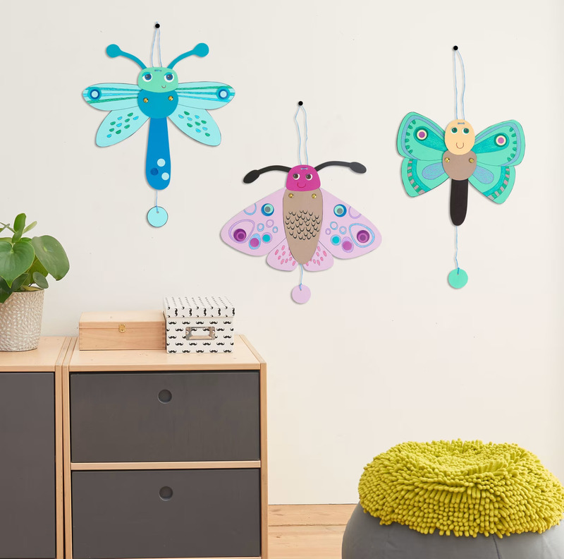 Stačí vystřihnout, ozdobit, spojit kousky přiloženými sponkami a převázat šňůrkou – a motýli začnou veselé mávat křídly!