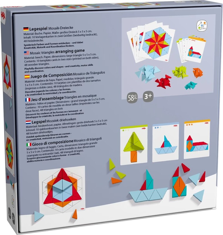 Sada obsahuje 46 dřevěných trojúhelníků, které mohou děti skládat podle předlohy nebo úplně volně podle vlastní fantazie, čímž se efektivně rozvíjí jejich kreativita.
