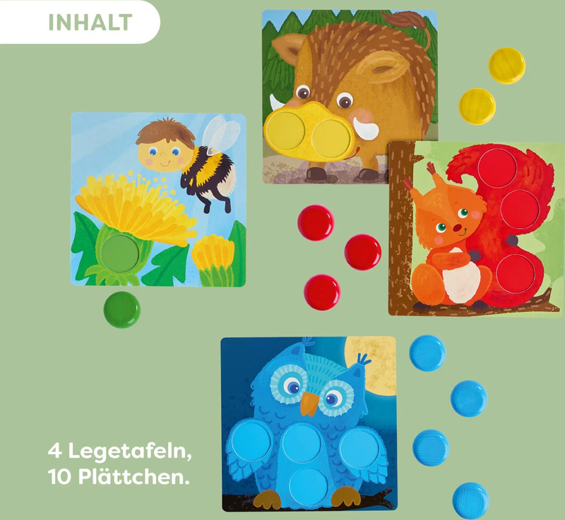 Hra se skládá ze čtyř podložek s různými prohlubněmi, do kterých děti vkládají dílky vyrobené z pravého bukového dřeva.