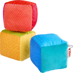 Tři měkké pěnové kostky v zářivých duhových barvách jsou vybaveny různými zvukovými efekty, které stimulují sluch a probouzejí zvědavost.