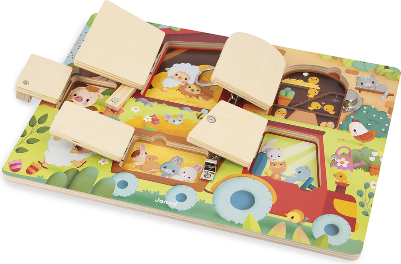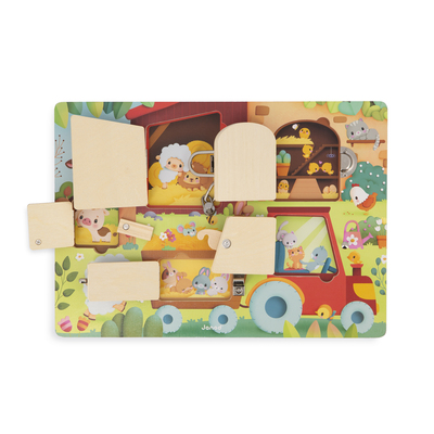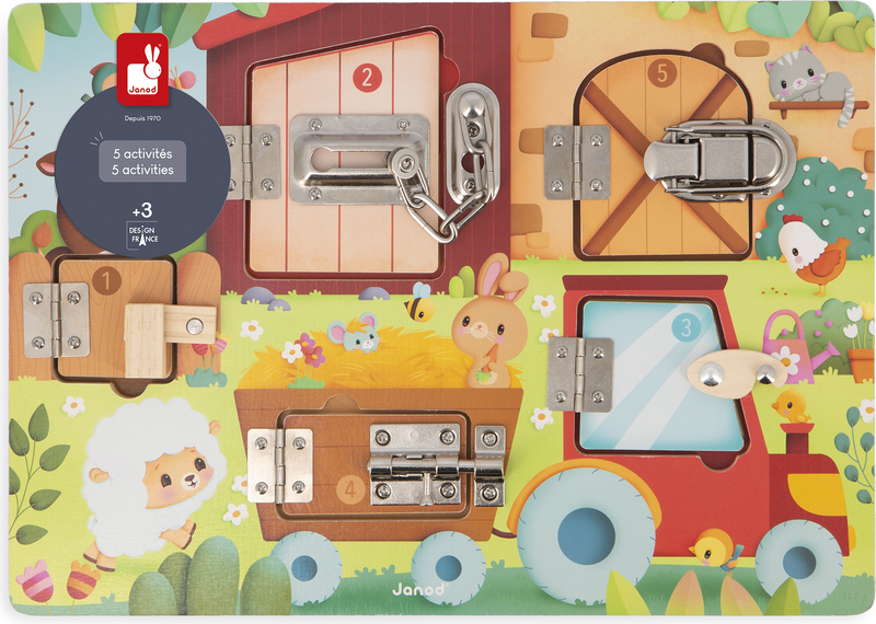 Klop, klop, klop! Kdo se skrývá za dveřmi stodoly? Tato pěkná zámková tabule ilustruje každodenní život hospodářských zvířat a jejich mláďat. Má 5 dvířek s různými systémy otevírání: dřevěný hák, dřevěná západka, řetízkový zámek, přepínací západka a knoflíkový zámek. Každé dvířka mají jiné číslo a překvapení!