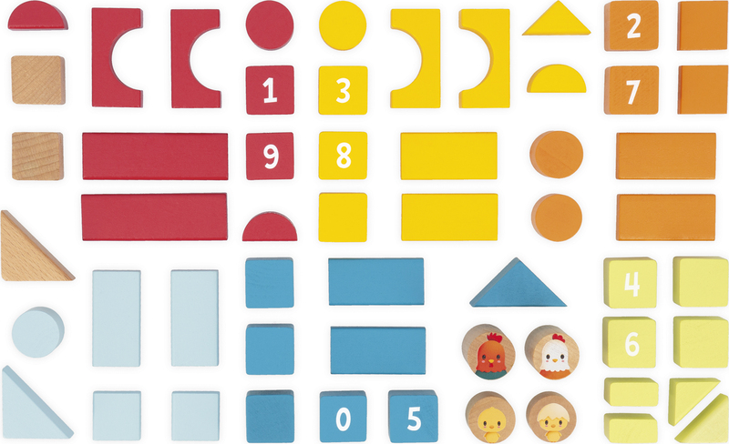 Skládejte, stavte, představujte si... tady je vědro s 56 vícebarevnými dílky s tématikou farmy, které rozvíjejí jemnou motoriku vašeho dítěte.Víko má otvory na dílky, takže se z něj stane zábavná třídící hra na jejich uklízení. Vaše dítě v něm najde také kruhy, čtverce a trojúhelníky, jakož i mosty a ilustrace (slepička, kohoutek a kuřátka), které rozvíjejí jeho fantazii.