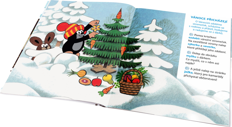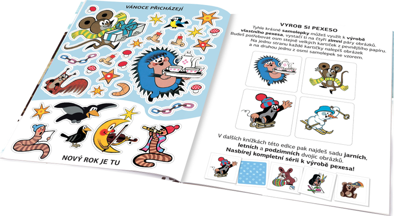 Dvojstránkové scény môžu deti nalepiť množstvom pôvabných samolepiek, či už podľa zadania, alebo podľa vlastnej fantázie. V knižke sa okrem toho dozvedia veľa nového a zaujímavého o zime a pomocou samolepiek si môžu vyzdobiť vlastný obrázok, pexeso alebo si vyrobiť pexeso!