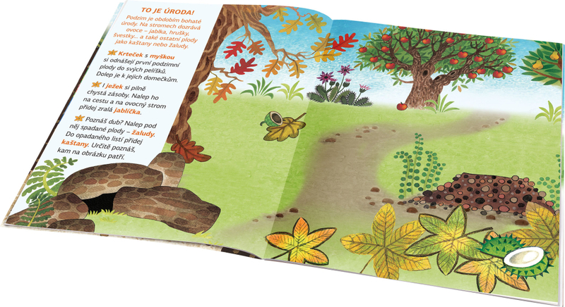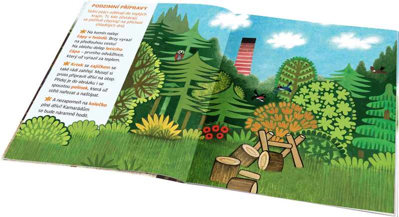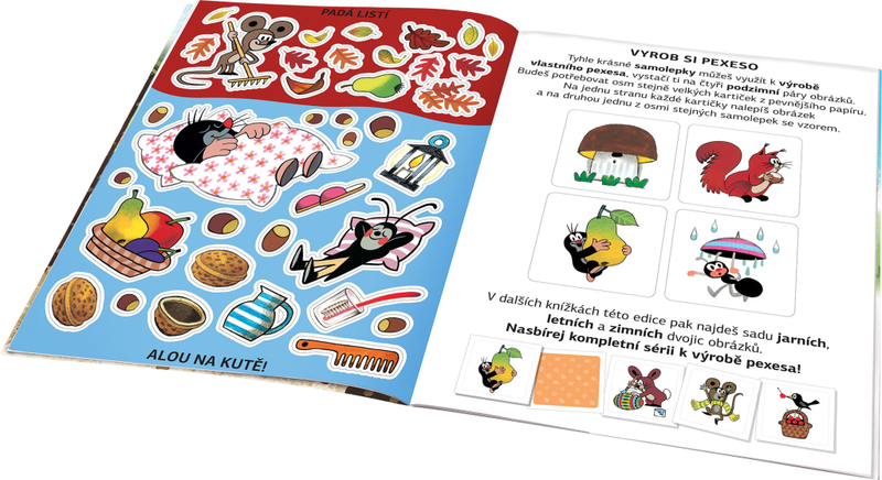 Kdo by neznal krtečka - nejmilejšího kresleného pohádkového hrdinu na světě? Vydejte se spolu s ním objevovat kouzlo ročních období na krásných obrázcích geniálního výtvarníka Zdeňka Milera! Dvojstránkové scény mohou děti doplňovat množstvím půvabných samolepek, buď podle zadání, nebo podle vlastní fantazie. V knize se kromě toho dozví hodně nového a zajímavého o podzimu a pomocí samolepek si mohou vyzdobit vlastní obrázek, pokojíček nebo vyrobit pexeso!