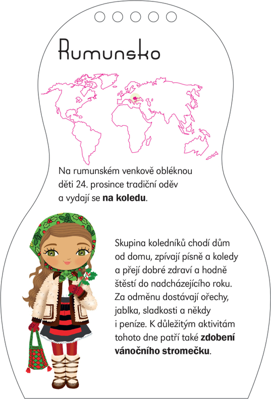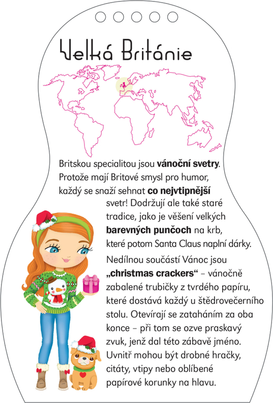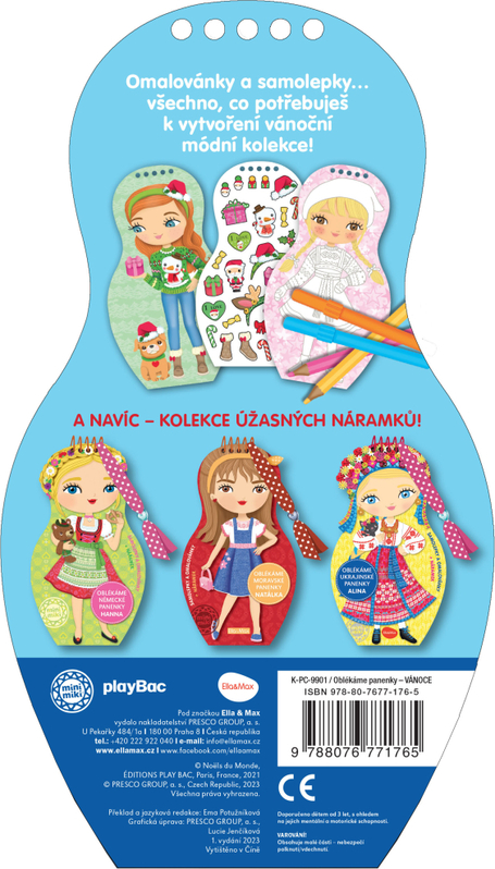 Ďalší titul našej obľúbenej série predstavuje malým čitateľom modely, ktoré si obliekajú ľudia z rôznych kútov sveta pri slávení Vianoc. Kreatívne omaľovanky, množstvo samolepiek… knižka obsahuje všetko, čo treba na vytvorenie nespočetných vianočných modelov. A okrem toho v nej deti nájdu aj veľa zaujímavých informácií! Ako sa oslavujú Vianoce vo Veľkej Británii, v Nórsku, vo Francúzsku, Rumunsku alebo v Rusku? To a ešte oveľa viac sa dozviete, ak sa vydáte za poznaním s našimi bábikami. A ku každej knižke dostanete krásny náramok pre šťastie!- Typ zboží: Špirálová, kroužková vazba