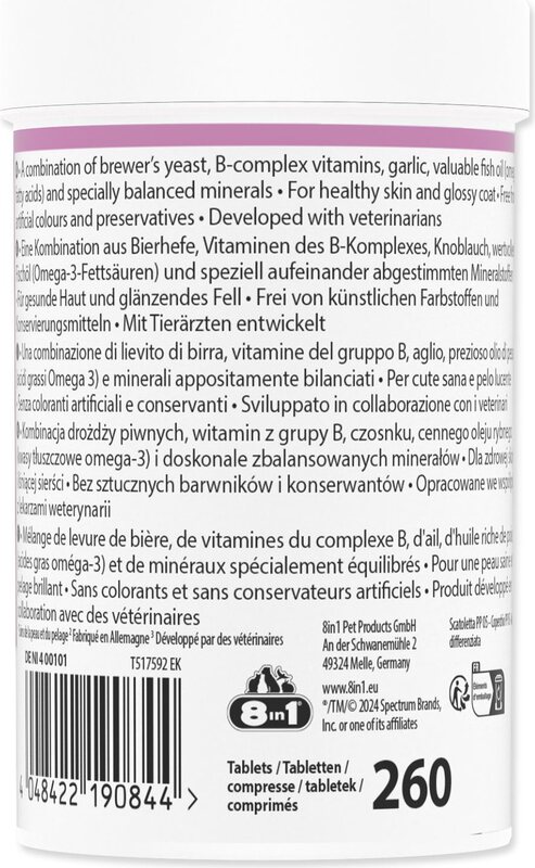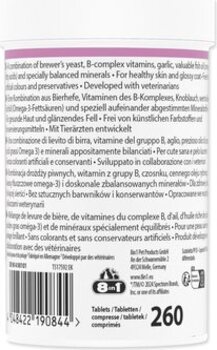 Kombinace pivovarských kvasnic, vitamínů skupiny B, česneku, rybího oleje a vyvážených minerálů zajišťuje vašemu psovi správnou výživu pro zdravou kůži a srst.