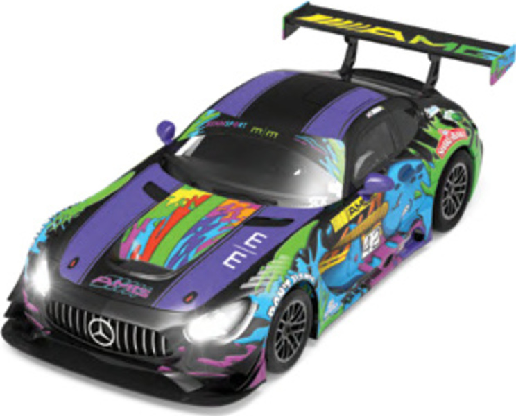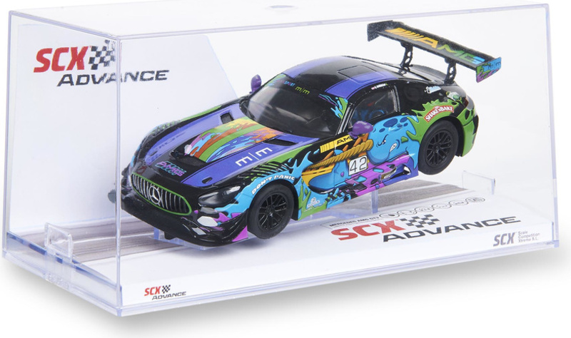 Dráhové autíčko SCX Advance Mercedes AMG GT3 Makes & Models v měřítku 1:32, verze 2.0, pro digitální autodráhy SCX Advance. Autíčko je vybaveno LED osvětlením. Na podvozku se nachází přepínač digital / analog - autíčko lze tedy používat na digitální autodráze SCX Advance i na analogové autodráze SCX Original.