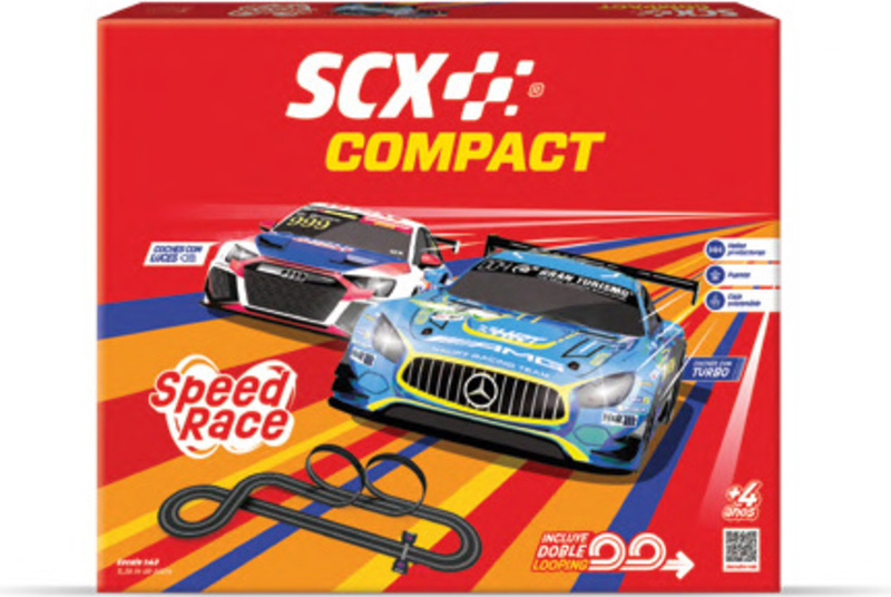 Autodráha SCX Compact Speed Race v měřítku 1:43 - analogová autodráha s mostem, svodidly, 2x loopingem a počítadlem kol. Dva ergonomické ovladače, dvě detailní dráhová autíčka se světly, Audi a Mercedes-Benz. Délka tratě: 5,36 m. Složení tratě je velmi snadné, jednotlivé traťové díly zacvaknete do sebe, připojíte ovladače a můžete začít závodit.