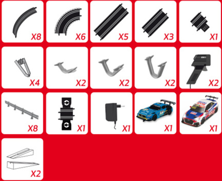 Balení obsahuje traťové díly, most, svodidla, dvojitý looping, počítadlo kol, 2x dráhové autíčko, 2x ovladač a napájecí zdroj.