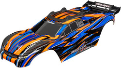 Náhradní díl pro RC modely aut Traxxas Rustler 4x4 1:10 VXL: karosérie oranžová. Nabarvená, aplikované obtisky, sestavená s předním a zadním držákem nástavby a zadní podpěrou nástavby pro montáž bez klipů. Rozvor 295mm.