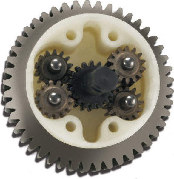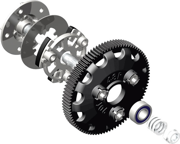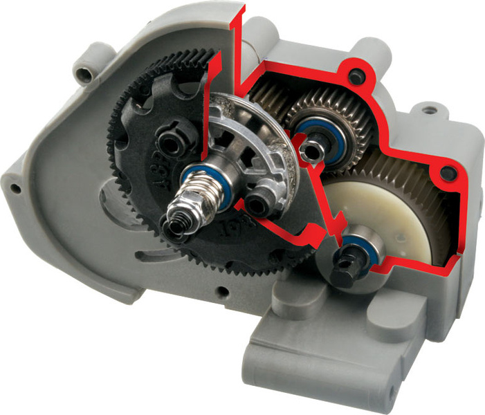Převodovka, disková spojka a planetový diferenciál jsou uzavřeny do jednoho kompaktního celku. Převodovka s třecí spojkou spolehlivě přenáší výkon motoru na nápravy, planetová převodovka diferenciálu Magnum 272™ má ozubená kola vyrobená z kalené oceli. Tento systém vyžaduje naprosto minimální údržbu. K dispozici jsou pastorky a ozubená kola s různými počty zubů, takže si můžete model přesně vyladit pro rychlostní i technické tratě.