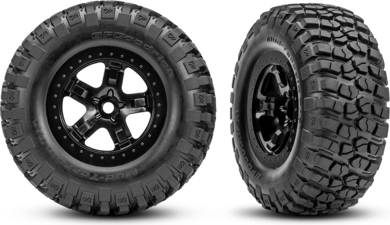 Model je vybaven koly SCT Split-Spoke s imitací Beadlock kroužku o průměr 2,2/3” a pneumatikami BFGoodrich® Mud-Terrain™ T/A® s vynikající přilnavostí. Unašeč je šestihran 12 mm.
