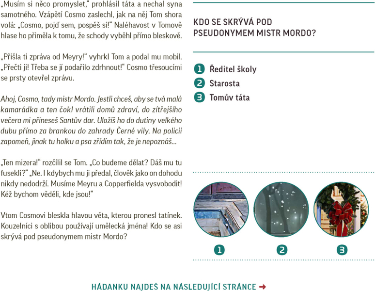 Ve škole třináctiletého Cosma se chystá vánoční tombola, ale v noci za záhadných okolností zmizí hlavní cena - velká perníková chaloupka. Zvláštní stopa zavede Cosma a jeho kamarády do tajemné Černé vily. Rozhodnou se rozluštit tajemství tohoto strašidelného sídla. Máte dost odvahy a důvtipu? Pomůžete jim rozluštit všechny hádanky, odhalit záhadu domu a zmizení perníkové chaloupky a zachránit školní vánoční slavnost?
