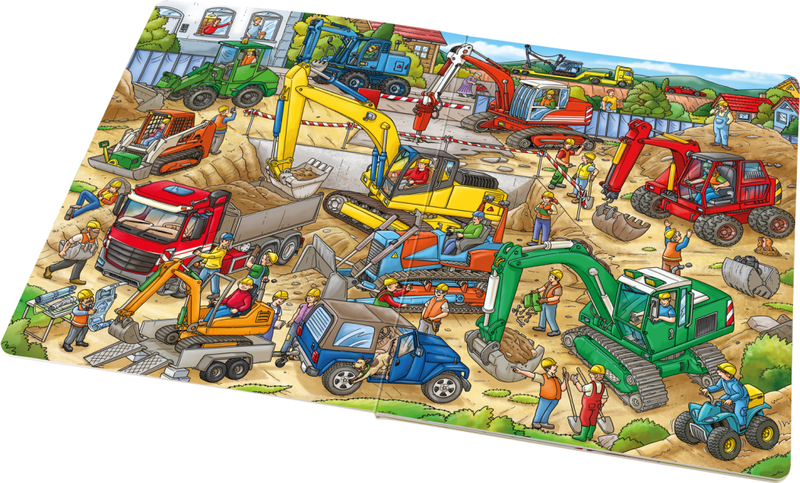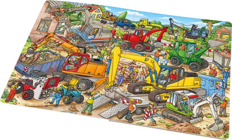 Toto velkoformátové obrázkové leporelo ocení především fanoušci náklaďáků, bagrů, rypadla a dalších strojů, které pomáhají všude tam, kde vzniká něco nového. Červený bagr s dvojitými pneumatikami, zelený kolový nakladač, oranžový mini bagr, žluté pásové rypadlo,… rozmanitá technika vykonává ty nejnáročnější práce. A také je zde potřebné množství lidí, kteří umí práci strojů naplánovat, a také ty, kteří je dokážou obsluhovat! Když se budete dobře dívat, objevíte některé stroje a hrdiny na každé stránce a můžete tak sledovat jejich příběhy.