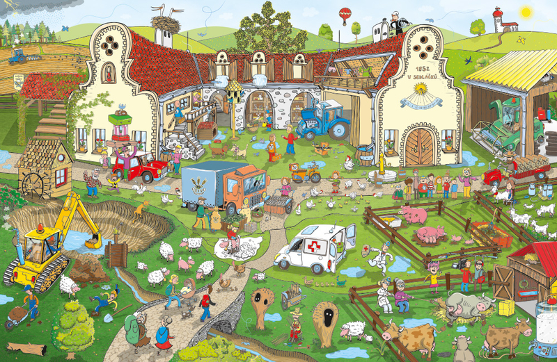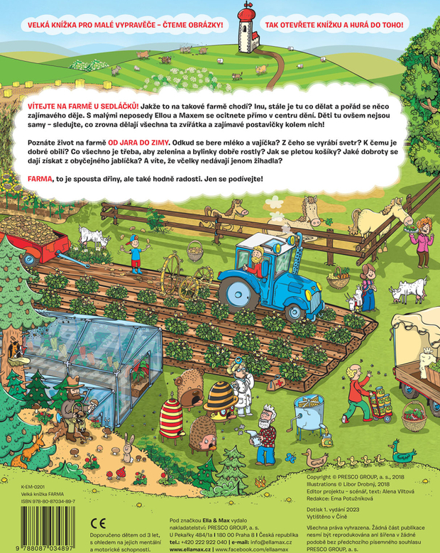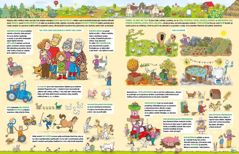 VÍTEJTE NA FAŘE U SEDLÁČKŮ! Jak to na takové farmě chodí? No, stále je tu co dělat a stále se něco zajímavého děje. S malými neposedy Ellou a Maxem se ocitnete přímo v centru dění. Děti tu však nejsou samy - sledujte, co právě dělají všechna ta zvířátka a zajímavé postavičky kolem nich!Poznáte život na farmě OD JARA DO ZIMY. Odkud se bere mléko a vejce? Z čeho se vyrábí svetr? Na co je dobré obilí? Co všechno je potřebné, aby zelenina a bylinky dobře rostly? Jak se pletou košíky? Jaké dobroty se dají získat z obyčejného jablka? A víte, že včelky nedávají jen žihadla?