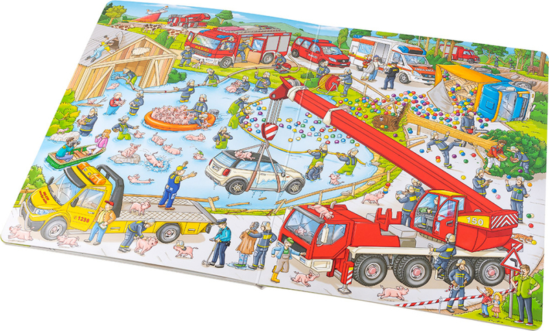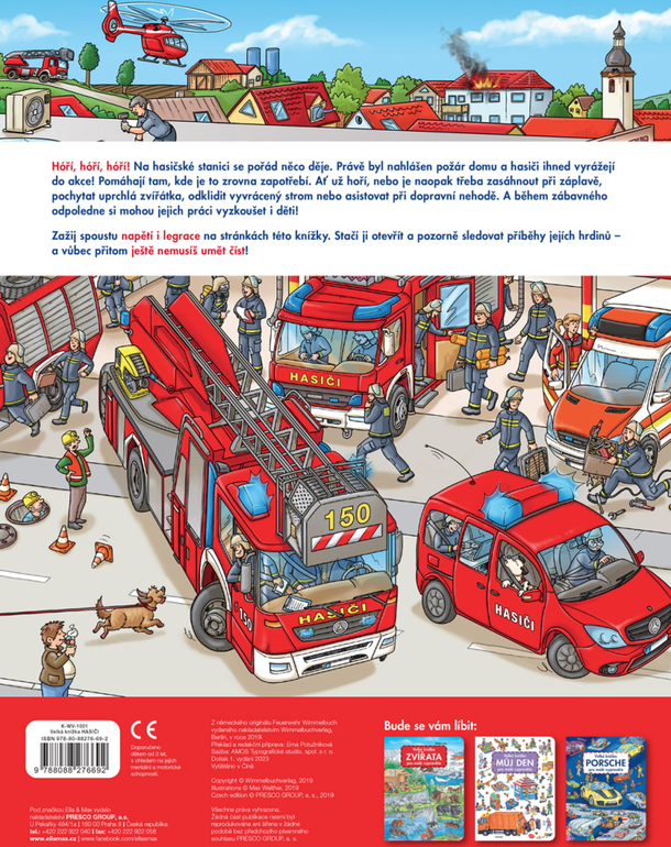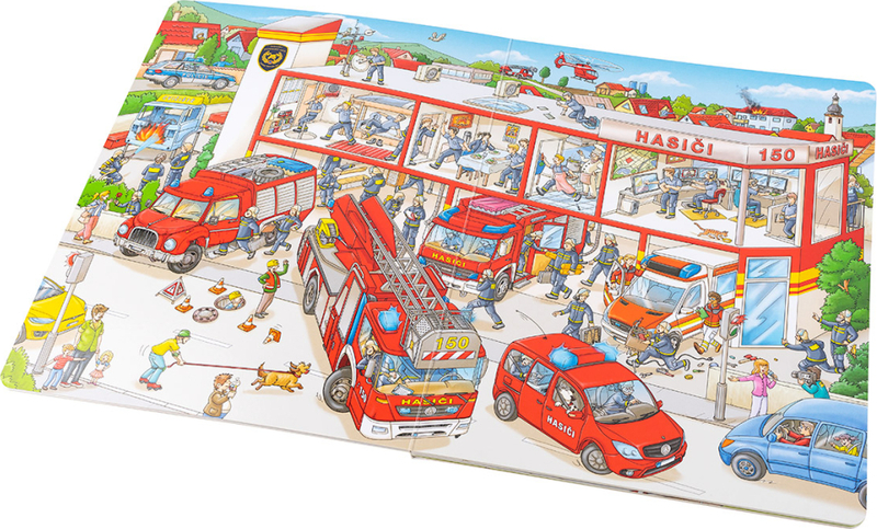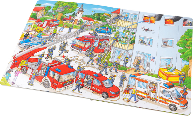 Hoří, hoří, hoří! Pozor - hasiči vyrážejí do akce! Rychle si oblékli výstroj, nasadili přilby a už se řítí se zapnutou sirénou k hořícímu domu. Rychle připravit dlouhý hasičský žebřík a stříkačky a hasit! Je třeba vysvobodit z plamenů nešťastníky, kteří nestihli včas utéct před ohněm a zůstali uvězněni v domě. To je také práce hasičů: odvážně se vrhají do plamenů, aby před požárem zachránili vše živé. Detailní ilustrace v další z řady velkých obrázkových knih seznámí malé čtenáře s rozmanitou prací hasičů a s každodenním životem na stanici. Stačí se jen ponořit do barevného světa obrázků a pozorně sledovat.
