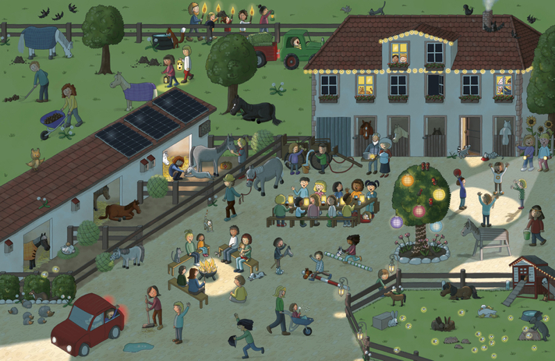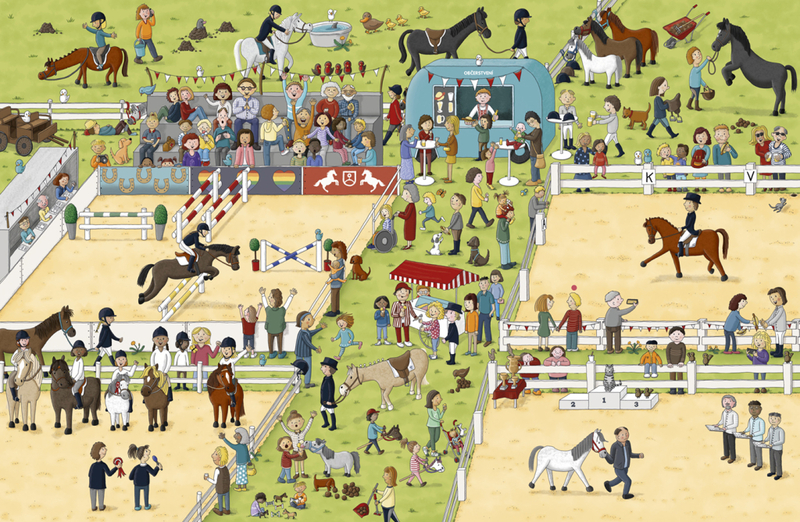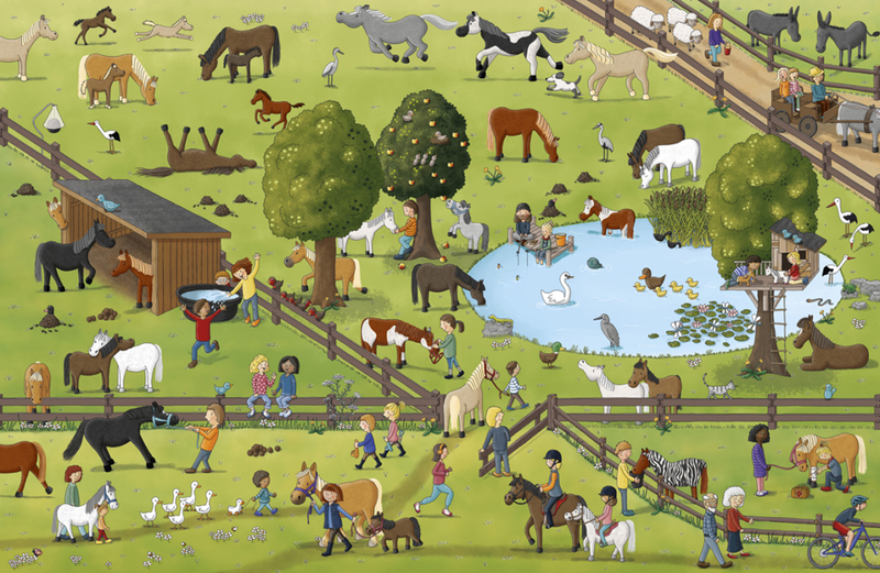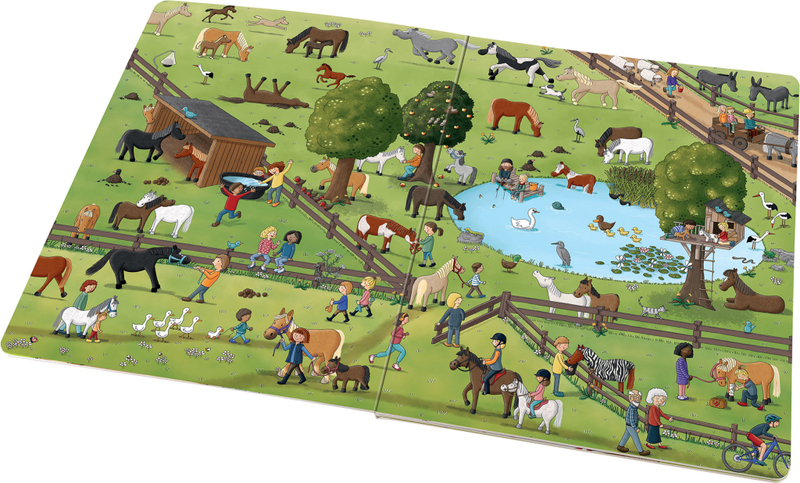 V této velké obrázkové knize zažijete úžasný den mezi koňmi a poníky. Na velkoformátových ilustracích můžete obdivovat tyto krásné a ušlechtilé tvory. Nahlédněte do každodenního života na koním farmě: vyrazíte na výlet, budete je povzbuzovat na dostizích nebo sledovat hřebce, klisny a hříbata na pastvině. Zjistíte, co všechno obnáší péče o tato zvířata, co mají ráda nebo při jakých činnostech mohou člověku pomoci. Některé postavičky a zvířátka můžete hledat na každé dvojstránce znovu a znovu a sledovat jejich příběhy. Je to celkem fuška, ale hlavně, velká zábava!