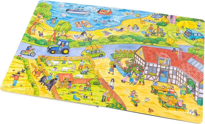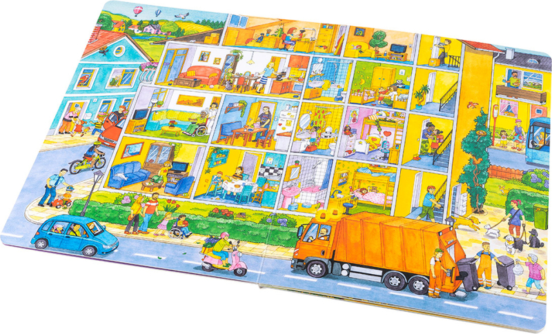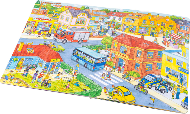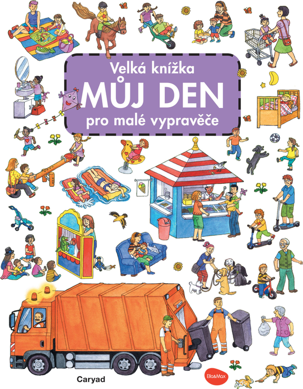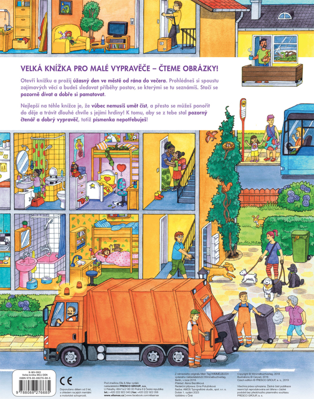 Otevřete tuto velkou obrázkovou knihu a zažijte úžasný den ve městě, kde se od rána do večera tolik děje! Od brzkých ranních hodin se na ulicích objevují popeláři, kteří svým vozem vyvážejí plné popelnice. Je čas vstát z postele, vyčistit si zuby a nasnídat se. A pak hurá do školky! Je také potřeba zařídit nákupy. Hasiči a policisté jsou v pohotovosti, na stavbě panuje rušno. I v parku to žije - děti i dospělí se tu baví, pochutnávají si na zmrzlině nebo jen tak odpočívají... A co tak krátký výlet ke vodním hrám k jezeru nebo na nedalekou farmu za zvířátky? Večer se pak všichni vrací do svých domovů, aby se unavení po vzrušujícím dni uložili do postýlek a postelí. Sladké sny!Veľká kniha - Môj deň pre malých rozprávačov
