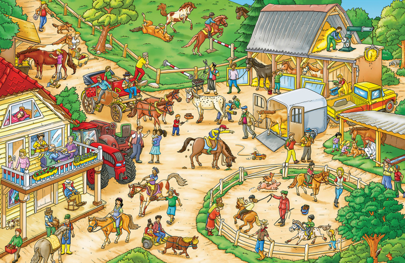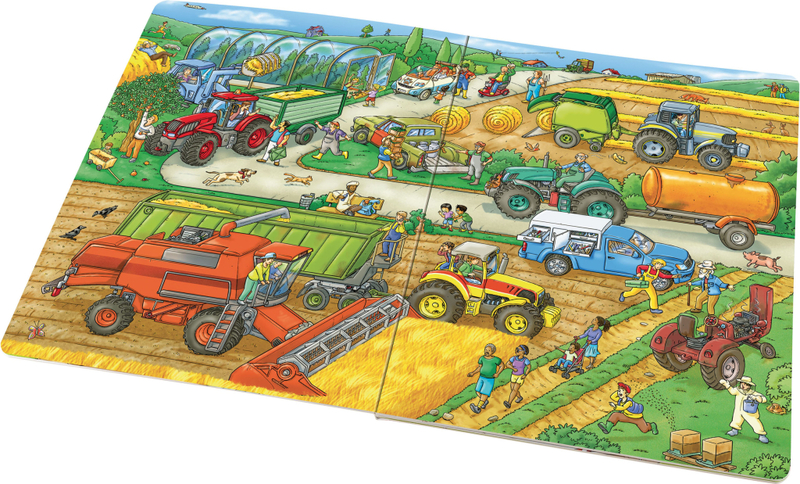 Budete sledovat impozantní zemědělské stroje při práci, ale také se bavit, například na jezdeckém turnaji nebo na koncertě. Některé postavičky a zvířátka můžete hledat na každé dvojstránce znovu a znovu a sledovat jejich příběhy.