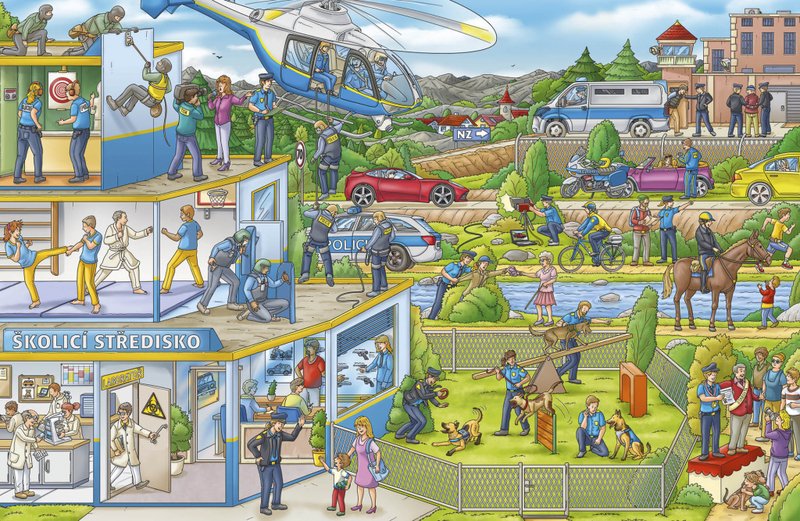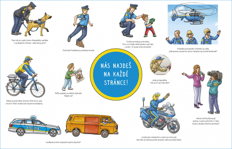 Na policejní stanici je stále živo! Ze zlatnictví ve městě byly právě odcizeny vzácné šperky a policisté se vydávají po stopě zločinců. U řeky zase někdo právě zakládá černou skládku a Petrovi se ztratil pes. Pomůže policie i s tím? Sledujte všechny napínavé příběhy, které se odehrávají na stránkách tohoto úžasného velkoformátového leporela a zažívejte dobrodružství s hrdiny, které můžete na každé dvojstraně hledat znovu a znovu. Stačí se jen ponořit do barevného světa obrázků a pozorně se dívat… Detailní ilustrace přiblíží malým čtenářům rozmanitou práci policistů a každodenní život na stanici.