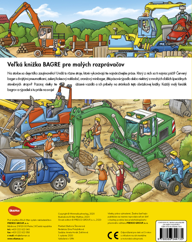Toto velkoformátové obrázkové leporelo ocení především fanoušci náklaďáků, bagrů, rypadel a dalších strojů, které pomáhají všude tam, kde vzniká něco nového.Červený bagr s dvojitými pneumatikami, zelený kolový nakladač, oranžový mini bagr, žluté pásové rypadlo,… rozmanitá technika vykonává ty nejnáročnější práce. A také je tu potřebné množství lidí, kteří umí práci strojů naplánovat, a i těch, kteří je dokáží obsluhovat!