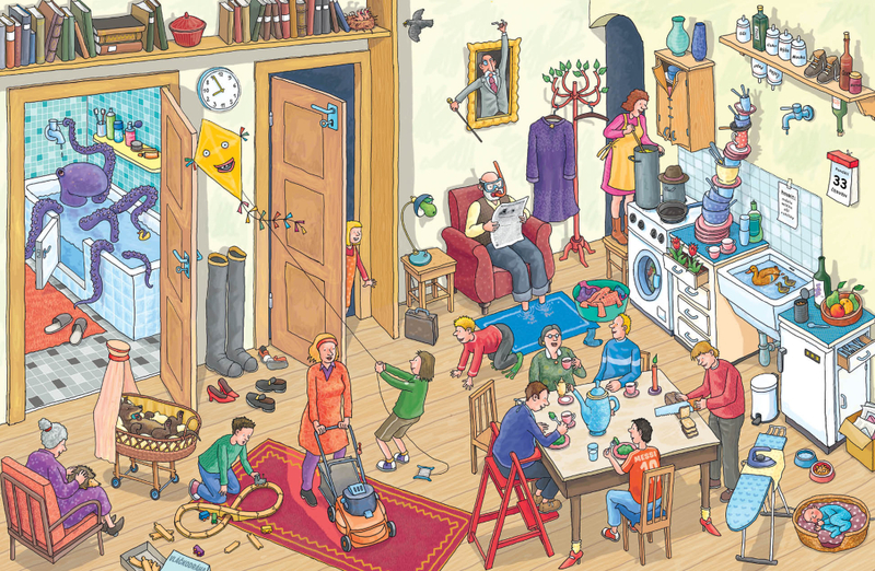 Když otevřete tuto knihu, řeknete si: Co to je? Kdo to nakreslil? To přece nemůže být pravda!Proč obrovská chobotnice sedí zrovna v naší vaně? Jak se tam dostala? A proč maminka pečlivě čistí koberec sekačkou na trávu? Jak to, že si pes Alík hoví v postýlce mého malého brášky? A kam se bráška ztratil? Zmatek nad zmatek!