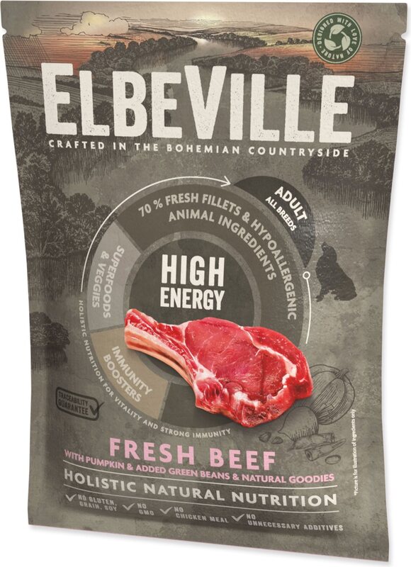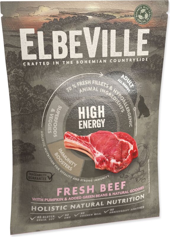 ELBEVILLE je přirozená strava pro celkové zdraví vašeho psa. Je vyrobena z nejlepších přírodních, lokálních surovin včetně tzv. superpotravin a s vysokým obsahem kvalitního čerstvého masa. Tato receptura obsahuje 35% čerstvých vykostěných filet z hovězího a dále 26% dehydrovaného kachního a krůtího.
