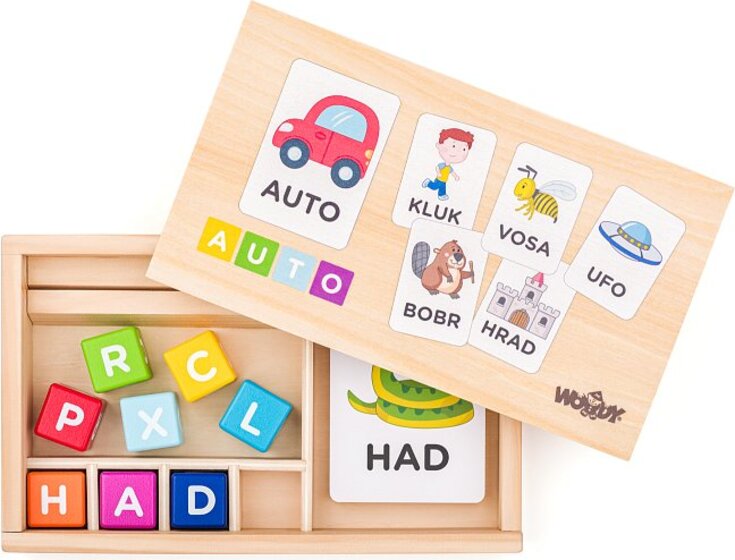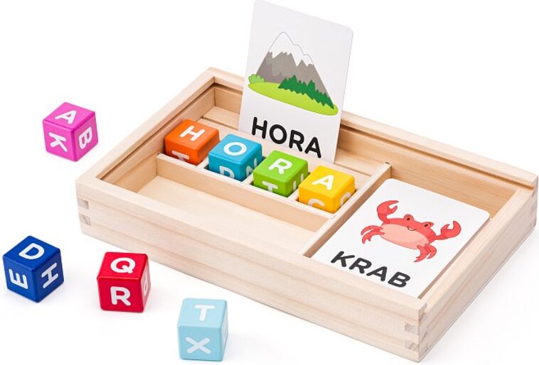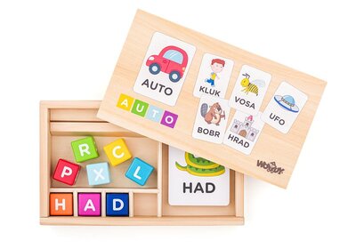 Na barevných kostkách se potom snaží najít jednotlivá písmena a správně je poskládat.